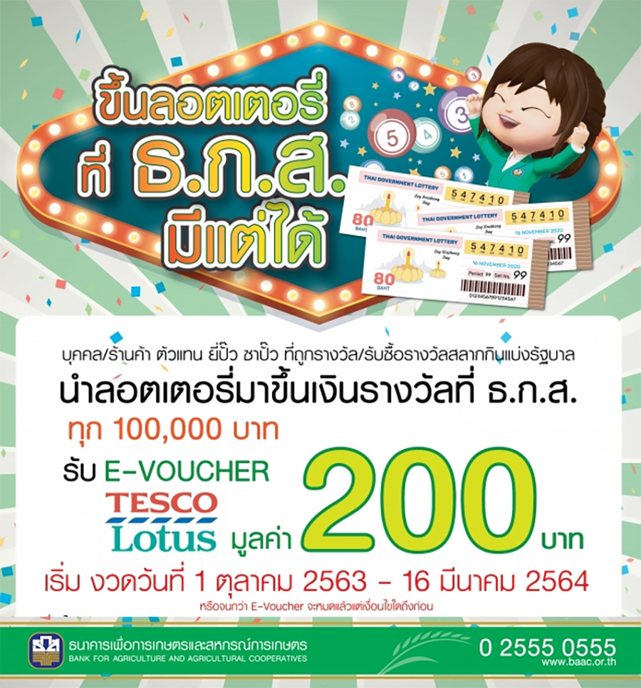 ขึ้นลอตเตอรี่ ที่ ธ.ก.ส. มีแต่ได้ ขึ้นรางวัลทุก 100,000 บาท รับ e-voucher Tesco Lotus 200 บาท*
