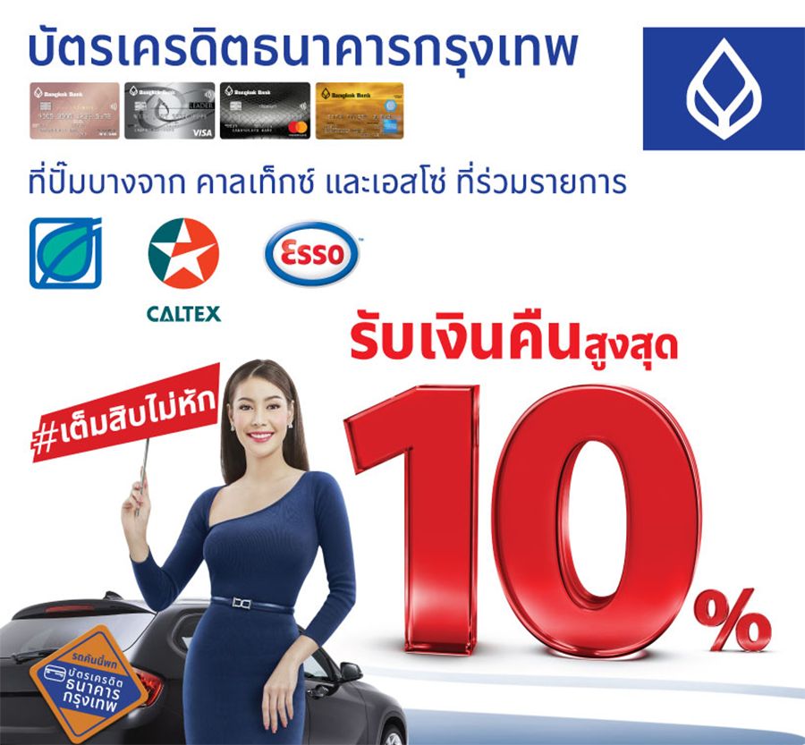 รับเงินคืนสูงสุด 10% ผ่านบัตรเครดิตธนาคารกรุงเทพ ที่ปั๊มบางจาก คาลเท็กซ์ และเอสโซ่ ที่ร่วมรายการ