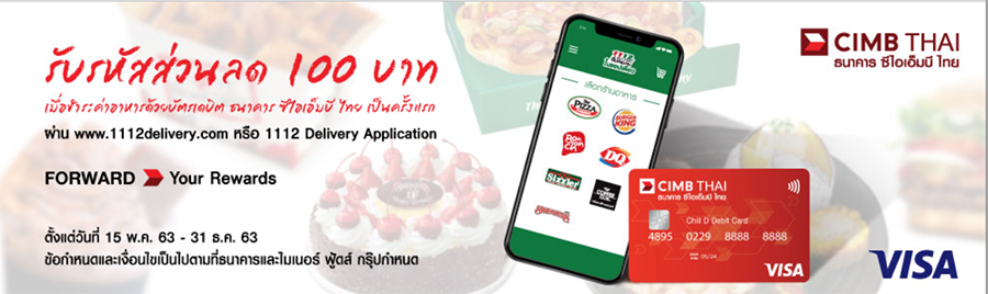 ฟรี! ส่วนลด 100 บาท เมื่อสั่งซื้ออาหารผ่าน 1112delivery ด้วยบัตรเดบิต ธนาคาร ซีไอเอ็มบี ไทย