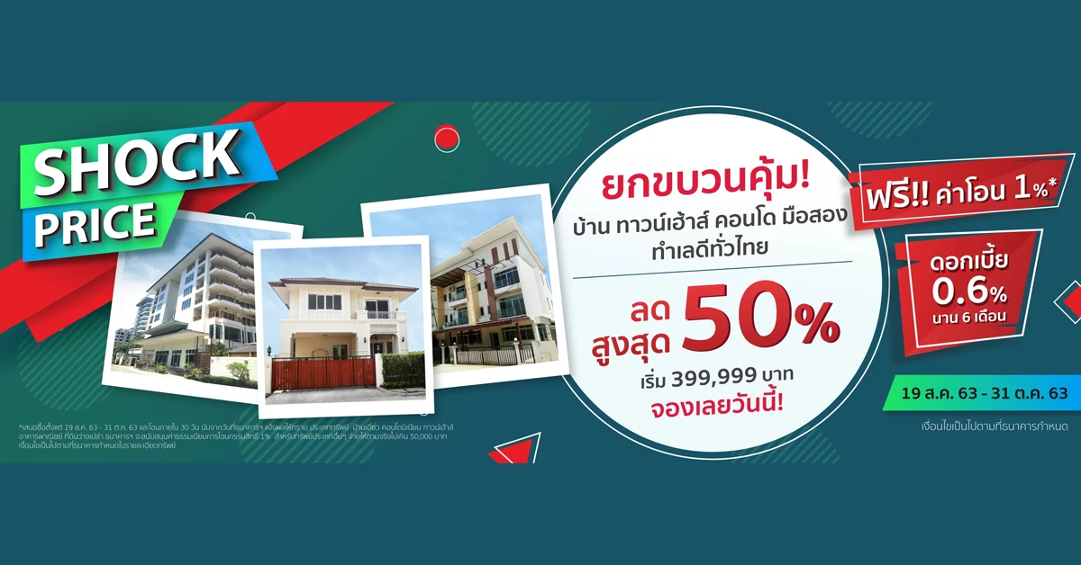 SHOCK PRICE!! ลดสูงสุด 50% ฟรี!! ค่าโอน 1% บ้านเดี่ยว ทาวน์เฮ้าส์ คอนโด มือสอง ทำเลดี ทั่วไทย
