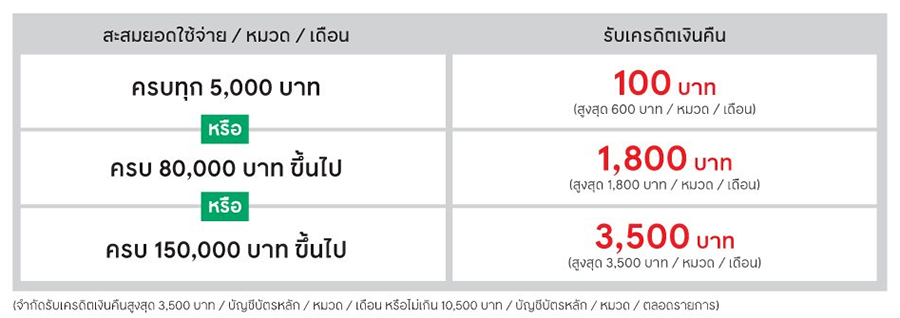 - สมาชิกบัตรฯ จะได้รับเครดิตเงินคืนภายใน 15 วัน หลังจากสิ้นเดือนของแต่ละเดือนในช่วงระยะเวลาส่งเสริมการขาย โดยจะเครดิตเงินคืนภายในวันที่ 15 พ.ย. 63 สำหรับยอดการใช้จ่ายจากเดือน ต.ค. 63, ภายในวันที่ 15 ธ.ค. 63 สำหรับยอดการใช้จ่ายจากเดือน พ.ย. 63 และ ภายในวันที่ 15 ม.ค. 64 สำหรับยอดการใช้จ่ายจากเดือน ธ.ค. 63 ซึ่งจำนวนเครดิตเงินคืนจะปรากฏในใบแจ้งยอดบัญชีของท่านทั้งนี้ขึ้นอยู่กับรอบบัญชีของแต่ละท่าน