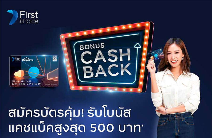 สมัครบัตรคุ้ม! รับโบนัสแคชแบ็คสูงสุด 500 บาท เมื่อสมัครบัตรโฮมโปร เฟิร์สช้อยส์ และผ่อนชำระสินค้าที่โฮมโปรทุกสาขาภายใน 60 วัน นับจากวันที่ได้รับอนุมัติ ตั้งแต่ 1 ต.ค. 63 - 31 ม.ค. 64