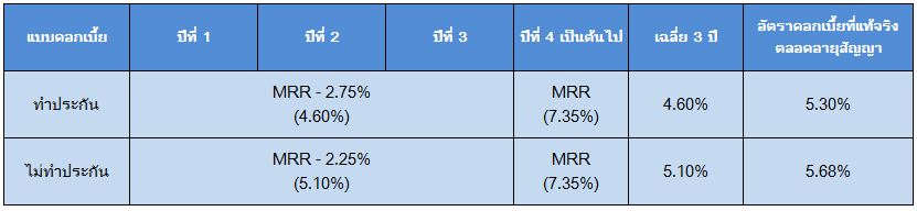 • อัตราดอกเบี้ยที่แท้จริงข้างต้นเป็นเพียงตัวอย่าง อัตราดอกเบี้ยสำหรับสินเชื่อที่อยู่อาศัยวงเงิน 3 ล้านบาท อายุสัญญา 10 ปี MRR = 7.35% (ณ วันที่ 14 เม.ย. 63) และใช้การผ่อนชำระค่างวดปกติที่คำนวณตามเงื่อนไขที่ใช้ในโฆษณาฉบับนี้เท่านั้น ซึ่งอาจมีความแตกต่างตามเงื่อนไขการกู้ยืมของลูกค้าแต่ละราย