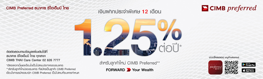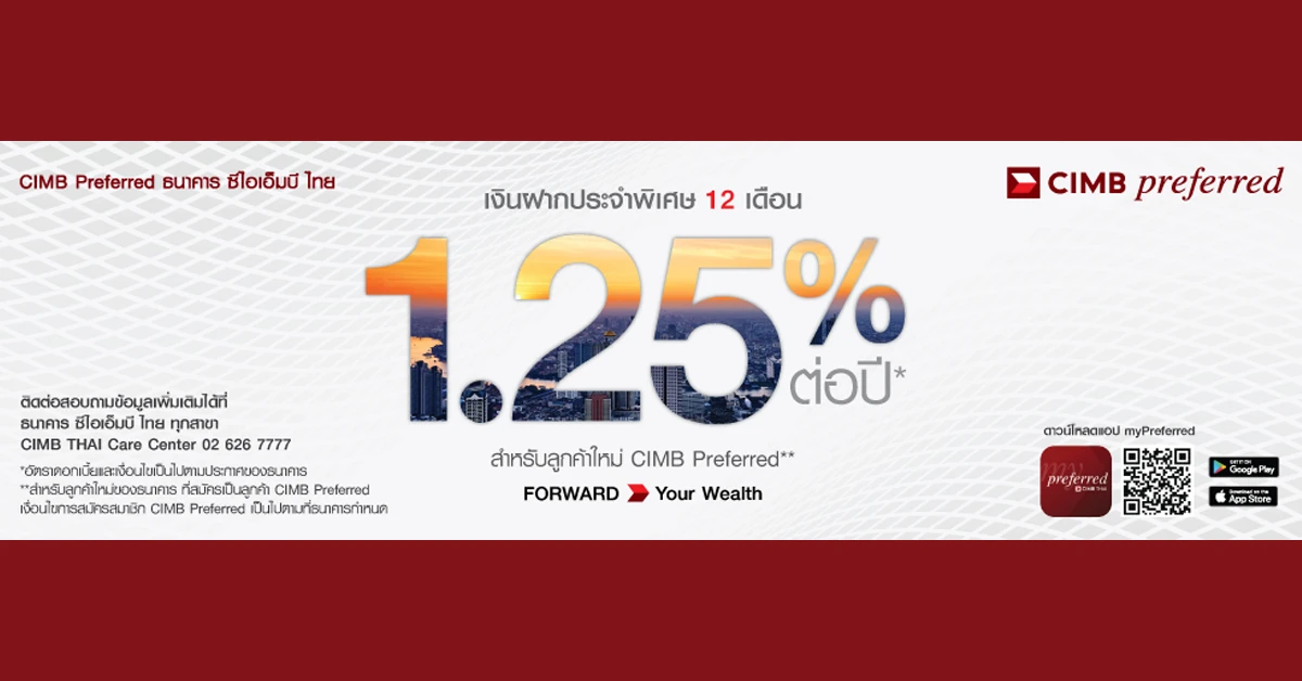โปรโมชั่นบัญชีเงินฝากดอกเบี้ยสูงสำหรับลูกค้าใหม่ CIMB Preferred บัญชีเงินฝากประจำพิเศษ 12 เดือน อัตราดอกเบี้ย 1.25% ต่อปี*