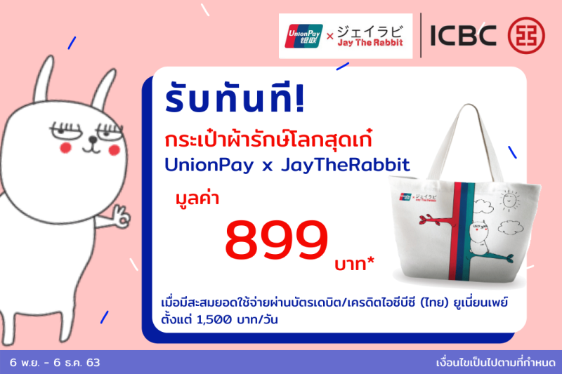 บัตรเครดิตไอซีบีซี (ไทย) ยูเนี่ยนเพย์ รับทันที! กระเป๋าผ้ารักษ์โลกสุดเก๋ UnionPay x Jay The Rabbit มูลค่า 899 บาท* เมื่อช้อปสะสมผ่านบัตรเดบิตหรือบัตรเครดิตยูเนี่ยนเพย์ตั้งแต่ 1,500 บาทขึ้นไปต่อวัน