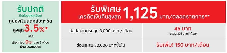 - **สงวนสิทธิ์เฉพาะสมาชิกบัตรฯ ที่ลงทะเบียนภายในวันที่ทำรายการที่ UCHOOSE หรือ SMS และมียอดใช้จ่ายตามเงื่อนไข ระหว่างวันที่ 7 พ.ย. 63 - 31 ม.ค. 64 เมื่อช้อปสะสมครบ ทุก 3,000 บาท รับเครดิตเงินคืน 45 บาท (จำกัดยอดใช้จ่ายสูงสุด 15,000 บาท หรือ เครดิตเงินคืนสูงสุด 225 บาท/บัญชีบัตรหลัก/เดือน) (จำกัดเครดิตเงินคืนรวมสูงสุด 675 บาท/บัญชีบัตรหลัก/ตลอดรายการ หรือ ยอดใช้จ่ายรวมครบสูงสุด 45,000 บาท/บัญชีบัตรหลัก/ตลอดรายการ) เมื่อช้อปสะสมครบ 30,000 บาท รับเพิ่มเครดิตเงินคืน 150 บาท (จำกัดยอดใช้จ่ายสูงสุด 30,000 บาท หรือ เครดิตเงินคืนสูงสุด 150 บาท/บัญชีบัตรหลัก/เดือน) (จำกัดเครดิตเงินคืนรวมสูงสุด 450 บาท/บัญชีบัตรหลัก/ตลอดรายการ หรือ ยอดใช้จ่ายรวมครบสูงสุด 90,000 บาท/บัญชีบัตรหลัก/ตลอดรายการ)
