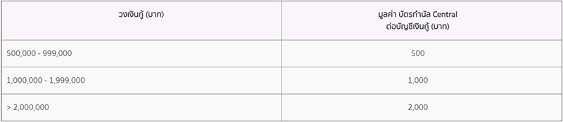 - ลูกค้าจะได้รับ Central Gift Voucher ตามวงเงินกู้ และจะได้รับภายใน 60 วันทำการ หลังจากสิ้นสุดระยะเวลาส่งเสริมการขายนี้ โดยจะจัดส่งให้ทางไปรษณีย์ตามที่อยู่ที่แจ้งแก่ธนาคารไว้