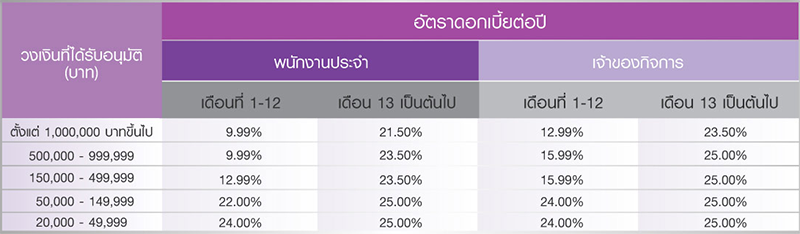 1) อัตราดอกเบี้ย 9.99% เฉพาะเดือนที่ 1-12 สำหรับลูกค้าที่เป็นพนักงานประจำ ที่โอนยอดหนี้ของบัตรเครดิตหรือสินเชื่อบุคคลอื่นๆ ของสถาบันการเงินอื่นๆ ของสถาบันการเงินอื่นที่ได้รับวงเงินตั้งแต่ 500,000 บาทขึ้นไป