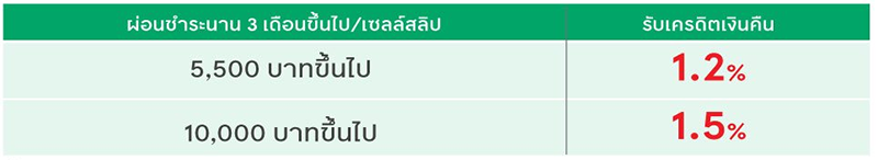 • ยอดผ่อนชำระ 5,500 บาทขึ้นไป/เซลล์สลิปและนาน 3 เดือนขึ้นไป รับเครดิตเงินคืน 1.2%