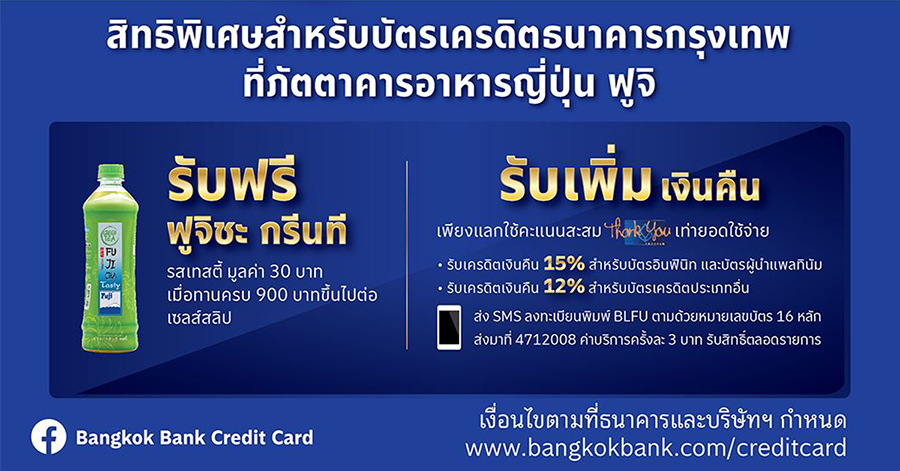 สิทธิพิเศษสำหรับผู้ถือบัตรเครดิตธนาคารกรุงเทพ เมื่อทานอาหารที่ภัตตาคารอาหารญี่ปุ่น ฟูจิ ครบ 900 บาทขึ้นไป/เซลล์สลิป รับฟรี ฟูจิชะ กรีนที รสเทสตี้ จำนวน 1 ขวด มูลค่า 30 บาท (จำกัด 1 ขวด/ท่าน/โต๊ะ/เซลล์สลิป หรือจนกว่าสินค้าจะหมด)
