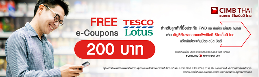 รับฟรี! e-Coupons Tesco Lotus 200 บาท สำหรับลูกค้าที่ซื้อประกัน FWD และหักชำระค่าเบี้ยฯ ผ่านบัญชี*