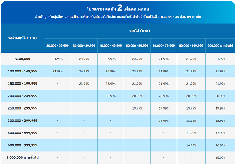 - บริษัทฯ ขอสงวนสิทธิ์ในการใช้หลักเกณฑ์และนโยบายภายในของบริษัทในการอนุมัติวงเงิน หรือปฏิเสธคำขอกู้ รวมถึงกำหนดอัตราดอกเบี้ยพิเศษซึ่งอาจแตกต่างจากตารางข้างต้น