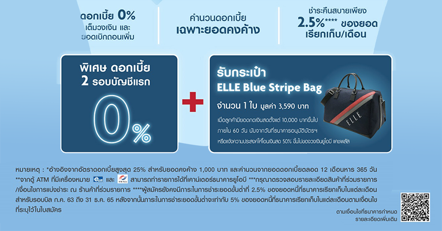 พิเศษ! ดอกเบี้ย 0% 2 รอบบัญชีแรก และรับกระเป๋า ELLE Blue Strip Bag มูลค่า 3,590 บาท เมื่อมียอดกดเงินสดตั้งแต่ 10,000 บาทขึ้นไป ภายใน 60 วัน นับจากวันที่ธนาคารอนุมัติบัตรฯ หรือแจ้งความประสงค์ให้โอนเงินสด 50% ขึ้นไปของวงเงินยูดอบี แคชพลัช