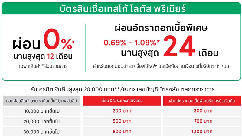 เงื่อนไขผ่อน - บัตรสินเชื่อเทสโก้ โลตัส พรีเมียร์ผ่อนชำระเครื่องใช้ไฟฟ้าอัตราดอกเบี้ย 0% นานสูงสุด 12 เดือน เฉพาะสินค้าที่ร่วมรายการ