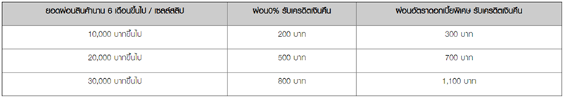 - ยอดเครดิตเงินคืนจะคำนวณจากยอดผ่อนชำระตั้งแต่ 10,000 บาทขึ้นไป/ เซลล์สลิป/ชิ้น และผ่อนชำระนาน 6 เดือนขึ้นไป เท่านั้น