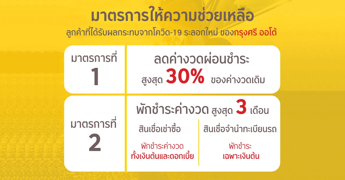 "ล่าสุด หลังจากธนาคารแห่งประเทศไทยได้ประกาศขยายเวลามาตรการช่วยเหลือลูกหนี้รายย่อยจากสถานการณ์การระบาดของโควิด-19 ระลอกใหม่ กรุงศรี ออโต้ ได้ประกาศมาตรการช่วยเหลือเพิ่มเติม โดยการปรับโครงสร้างหนี้ ด้วยการลดค่างวดผ่อนชำระ สูงสุด 30% ของค่างวดเดิม และให้การช่วยเหลือลูกค้าที่ได้รับผลกระทบในพื้นที่ที่ควบคุมสูงสุดตามประกาศของรัฐบาล ด้วยการให้พักชำระค่างวดสูงสุด 3 เดือน ครอบคลุมทั้งสินเชื่อเช่าซื้อรถยนต์และรถจักรยานยนต์ (พักชำระทั้งเงินต้นและดอกเบี้ย) และสินเชื่อจำนำทะเบียนรถ (พักชำระเฉพาะเงินต้น)" นางกฤติยา กล่าวเสริม