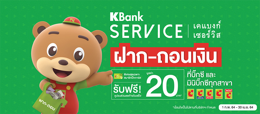 ลูกค้าธนาคารกสิกรไทย ฝาก-ถอนเงิน บัญชีธนาคารกสิกรไทย ที่แคชเชียร์บิ๊กซีทุกสาขา รับทันที คูปองส่วนลดท้ายใบเสร็จ 20 บาท สำหรับใช้เป็นส่วนลดซื้อสินค้าครั้งถัดไป เมื่อซื้อขั้นต่ำตั้งแต่ 150 บาท ขึ้นไปที่บิ๊กซีซูเปอร์เซ็นเตอร์ บิ๊กซีเอ็กซ์ตร้า บิ๊กซีมาร์เกต บิ๊กซีฟู้ดเพลส และมินิบิ๊กซีทุกสาขา