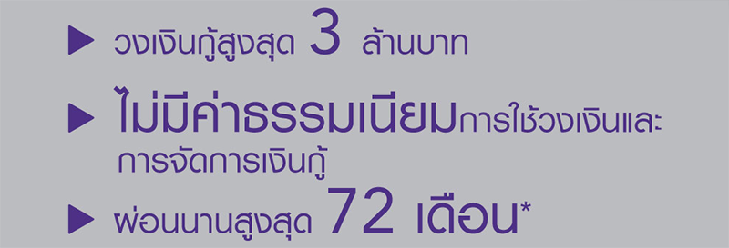 - ระยะเวลาการผ่อนชำระขั้นต่ำ 12 เดือน และสูงสุดไม่เกิน 72 เดือน โดยระยะเวลาผ่อนพิจารณาจากวงเงินสินเชื่อ