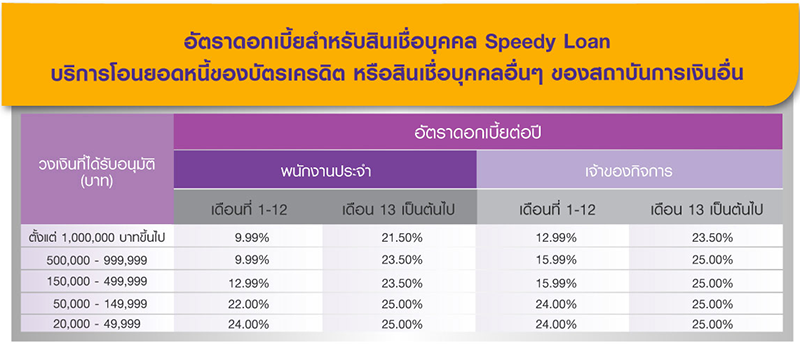 เงื่อนไขการบริการโอนยอดหนี้ของบัตรเครดิตอื่นๆ หรือ สินเชื่อบุคคลอื่นๆ - อัตราดอกเบี้ยสำหรับสินเชื่อบุคคล Speedy Loan บริการโอนยอดหนี้ฯ เฉพาะลูกค้าที่ได้รับการอนุมัติวงเงินสินเชื่อบุคคล Speedy Loan และสมัครใช้บริการโอนยอดหนี้ของบัตรเครดิตอื่นๆ หรือ สินเชื่อบุคคลอื่นๆ ของสถาบันการเงินอื่น ยอดสินเชื่อคงค้างอาจน้อยกว่ายอดหนี้ที่ท่านต้องการโอน ทั้งนี้ ขึ้นอยู่กับหลักเกณฑ์การอนุมัติที่ธนาคารกำหนด