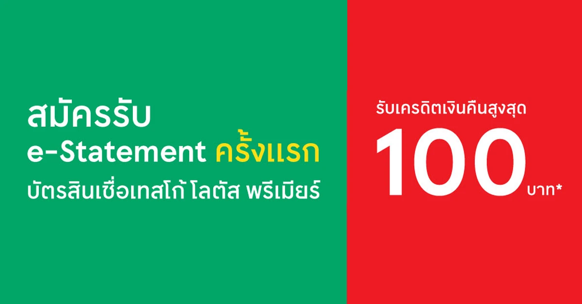 สมัครรับ e-Statement ครั้งแรก รับเครดิตเงินคืนสูงสุด 100 บาท จากบัตรสินเชื่อเทสโก้ โลตัส พรีเมียร์