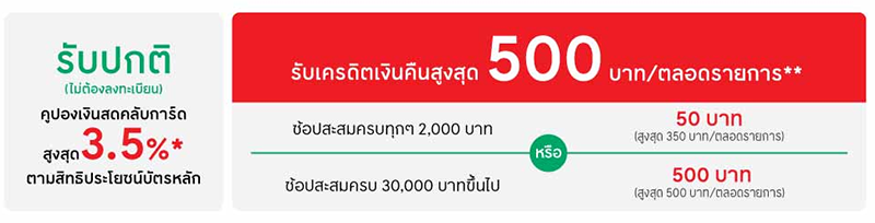 (จำกัดเครดิตเงินคืนรวมสูงสุด 500 บาท/บัญชีบัตรหลัก/ตลอดรายการ หรือ ยอดใช้จ่ายสูงสุด 30,000 บาท/บัญชีบัตรหลัก/ตลอดรายการ)