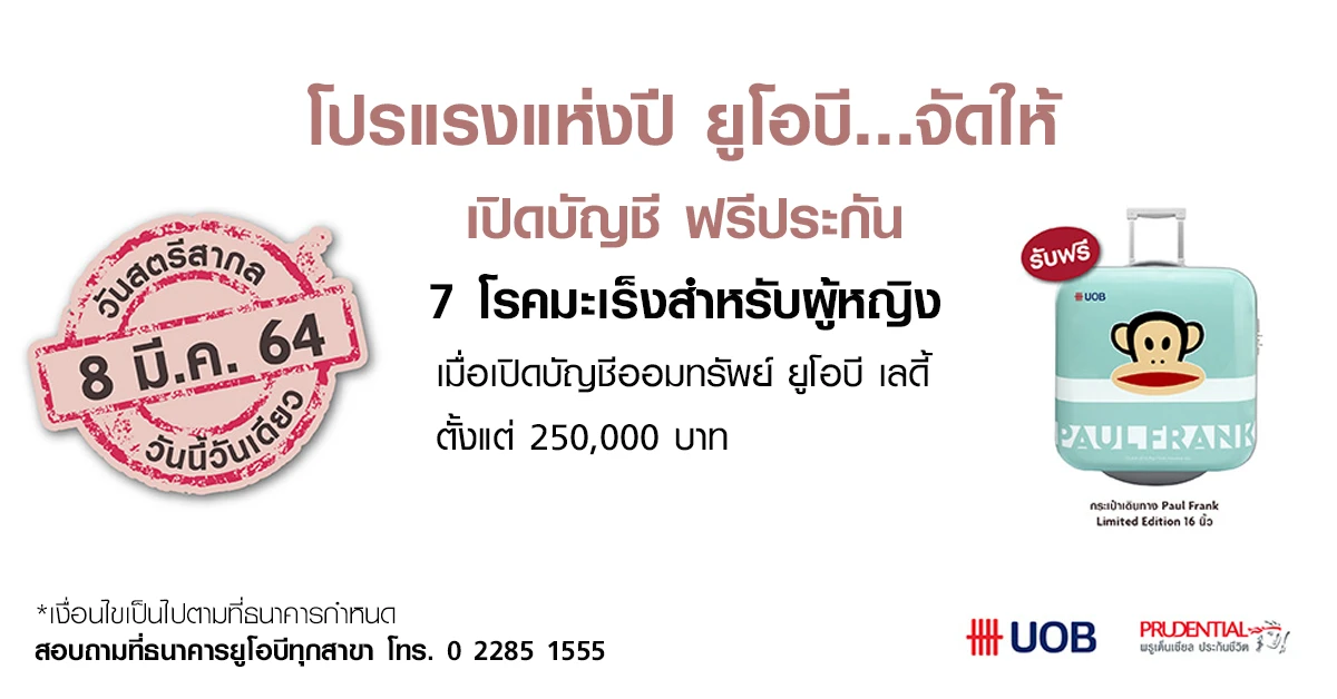 เปิดบัญชีออมทรัพย์ ยูโอบี เลดี้ ตั้งแต่ 250,000 บาทเป็นต้นไป รับ Paul Frank Trolley Bag 16 นิ้ว*