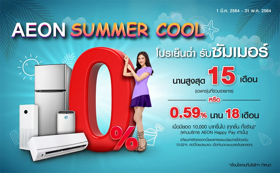 โปรเย็นฉ่ำ รับซัมเมอร์ ผ่อน 0% นานสูงสุด 15 เดือน หรือผ่อนนาน 18 เดือน ด้วยดอกเบี้ย 0.59%