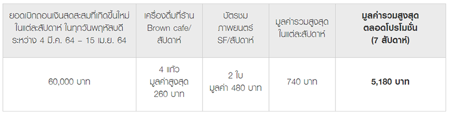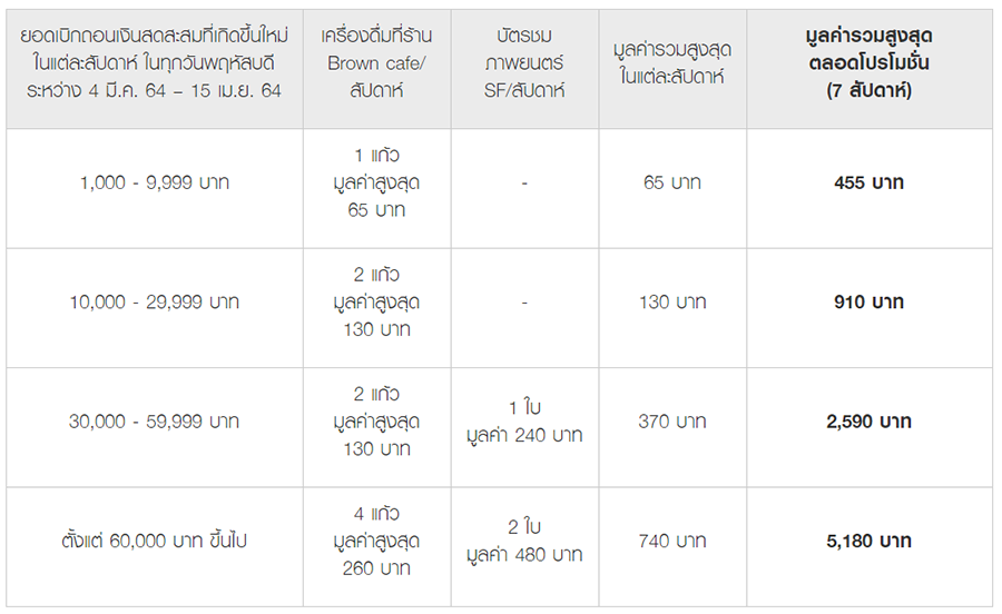 เงื่อนไขการรับเครื่องดื่มฟรี และรับบัตรชมภาพยนตร์ มูลค่ารวมสูงสุด 5,180 บาท เพียงมีรายการเบิกถอนเงินสดในทุกวันพฤหัสบดี ระหว่างวันที่ 4 มีนาคม 2564 - 15 เมษายน 2564