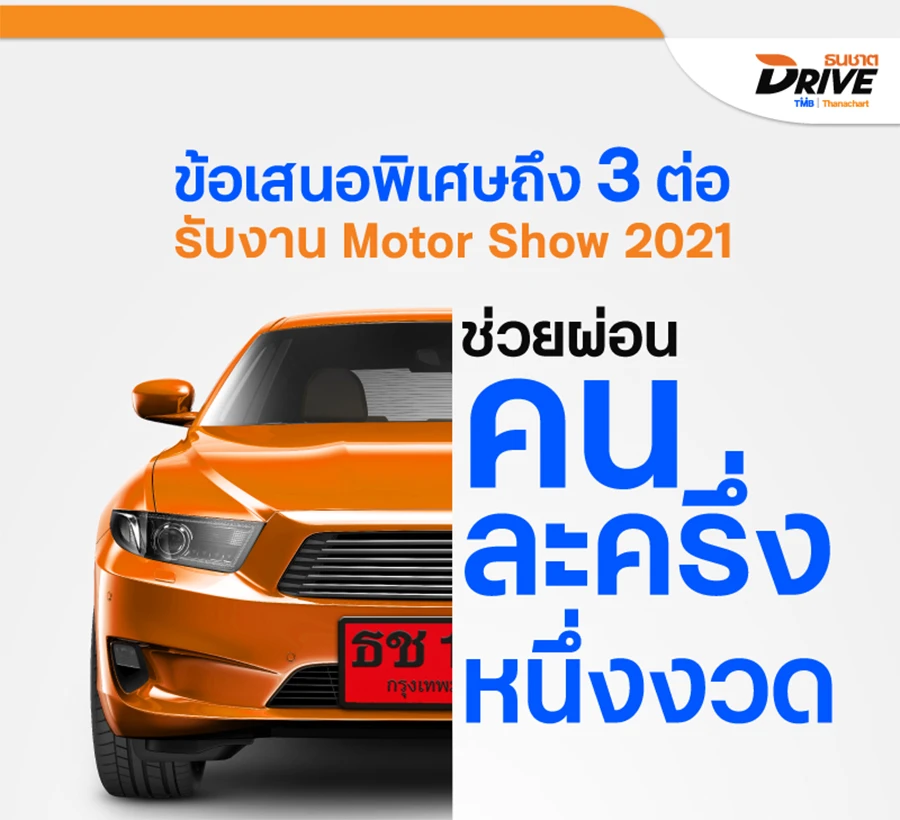ช่วยผ่อนคนละครึ่งหนึ่งงวด พร้อมรับข้อเสนอพิเศษถึง 3 ต่อ ในงาน Motor Show 2021 กับ ธนชาตDRIVE