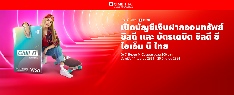 - เฉพาะลูกค้าที่สะสมยอดใช้จ่ายผ่านบัตรเดบิต ชิลดี ซีไอเอ็มบี ไทย (4895 0229) ผ่านช่องทางออนไลน์ ครบทุกๆ 1,000 บาทขึ้นไป ต่อเดือน ระหว่างวันที่ 1 เมษายน 64 - 30 มิถุนายน 64 รับ M-Coupon 7-Eleven มูลค่า 50 บาท