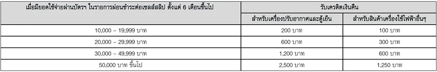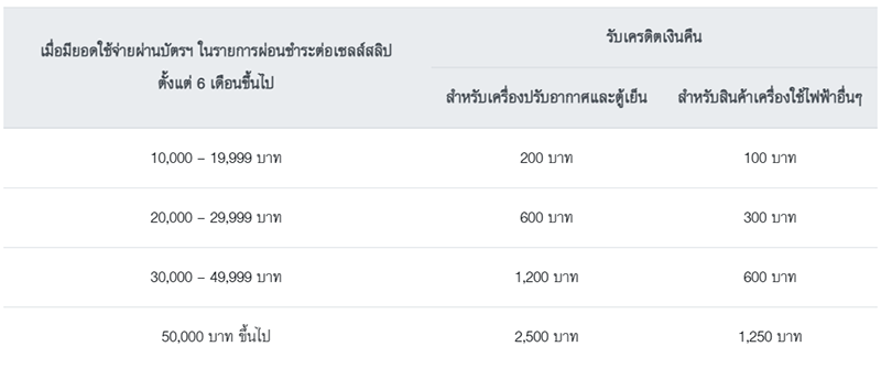 - สมาชิกที่มียอดใช้จ่ายผ่านบัตรฯ ในรายการผ่อนชำระ ตั้งแต่ 6 เดือนขึ้นไป ณ ร้านค้าที่ร่วมรายการ จะได้รับเครดิตเงินคืนเข้าบัญชีบัตรฯ ของสมาชิก ต่อเซลส์สลิป โดยคำนวณจากยอดใช้จ่ายผ่านบัตรฯ ตามที่กำหนด ดังนี้
