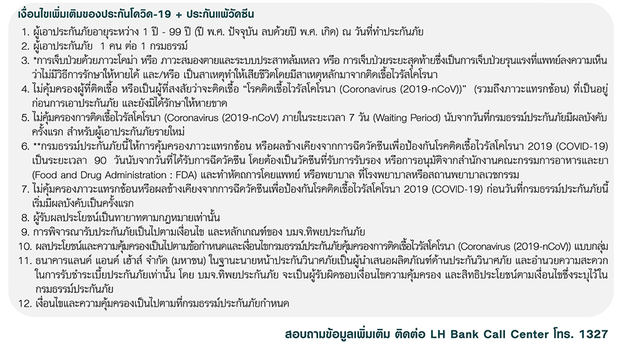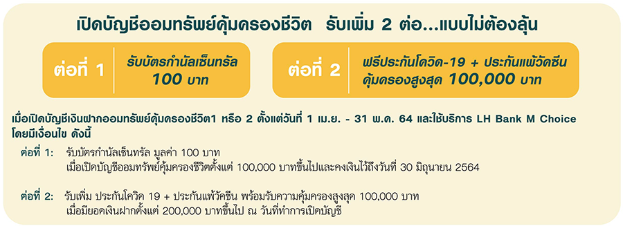 - ลูกค้าสามารถเปิดบัญชีเงินฝากออมทรัพย์คุ้มครองชีวิตได้สูงสุด 2 บัญชี โดยจะได้รับบัตรกำนัล 100 บาท/บัญชี สูงสุด 200 บาท และจะไ้รับแผนประกันโควิด-19 + ประกันแพ้วัคซีน ความคุ้มครองสูงสุด 100,000 บาท สูงสุด 1 แผนเท่านั้น