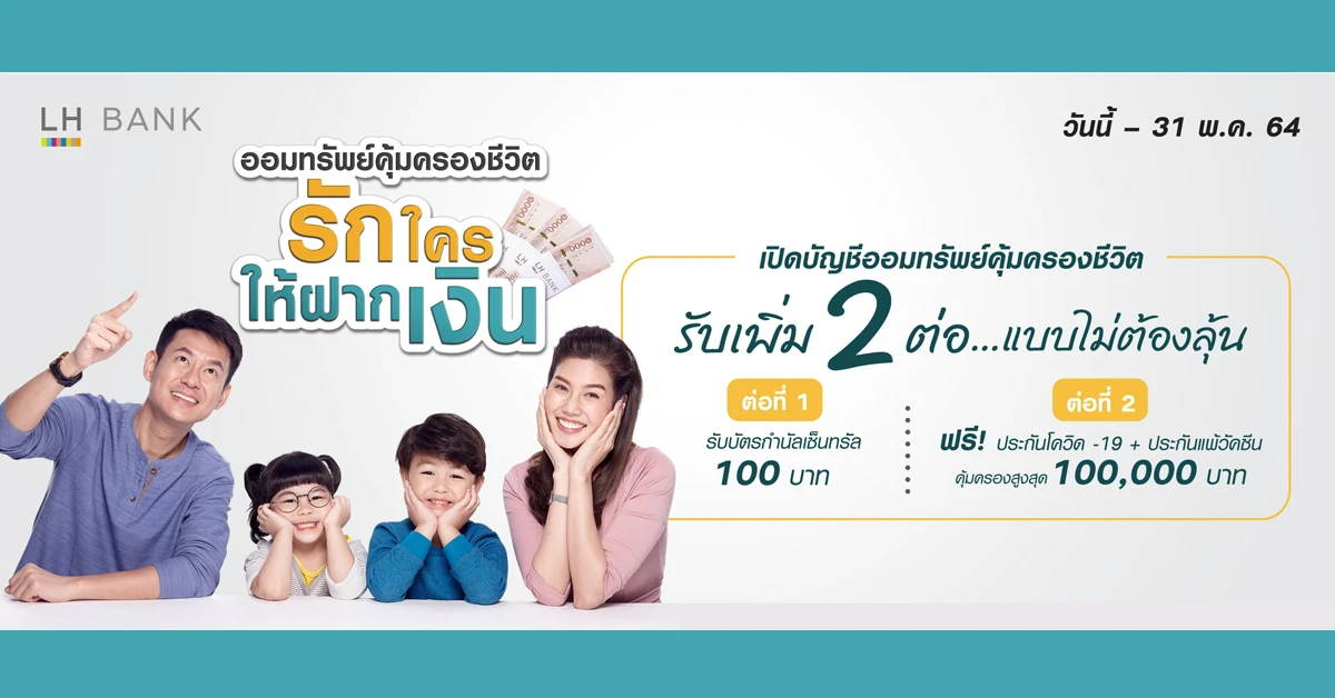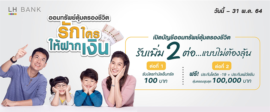 - ลูกค้าจะได้รับบัตรกำนัล 100 บาท เมื่อเปิดบัญชีเงินฝากออมทรัพย์คุ้มครองชีวิตตั้งแต่ 100,000 บาท พร้อมคงสถานะบัญชีปกติ และคงยอดเงินในบัญชีขั้นต่ำ 100,000 บาท ถึงวันที่ 30 มิ.ย. 64 และรับเพิ่มแผนประกันโควิค-19 +ประกันแพ้วัคซีน แผน 1 ความคุ้มครองสูงสุด 100,000 บาท เมื่อมียอดเงินฝากตั้งแต่ 200,000 บาทขึ้นไป ณ วันที่ทำการเปิดบัญชี