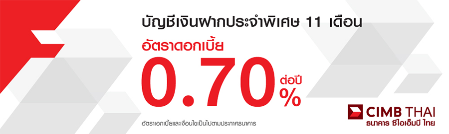 - ต้องมีหรือเปิดบัญชีเงินฝากออมทรัพย์ของธนาคาร ซีไอเอ็มบี ไทย จำกัด (มหาชน) ในวันที่ทำรายการฝาก โดยชื่อบัญชีเงินฝากออมทรัพย์จะต้องมีชื่อเจ้าของบัญชีเงินฝากประจำพิเศษ 7, 11 เดือน
