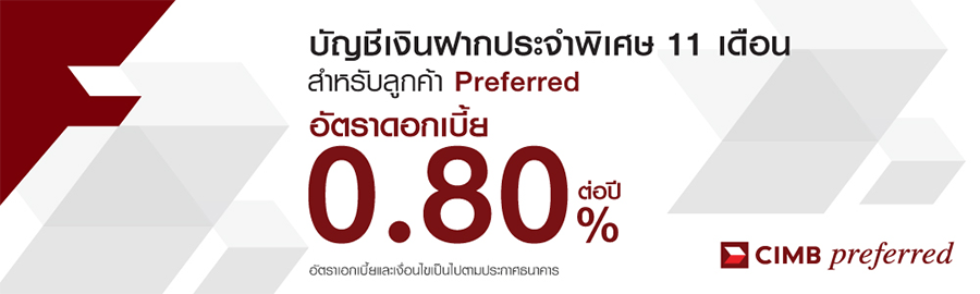 บัญชีเงินฝากประจำพิเศษ 7, 11 เดือน CIMB Preferred and CIMB Thai Private Banking สำหรับลูกค้า CIMB Preferred หรือ CIMB Thai Private Banking ประเภทลูกค้าบุคคลธรรมดาเท่านั้น หรือสมัครเป็นลูกค้า CIMB Preferred หรือ CIMB Thai Private Banking ในวันและเวลาเดียวกันกับการขอเปิดบัญชี