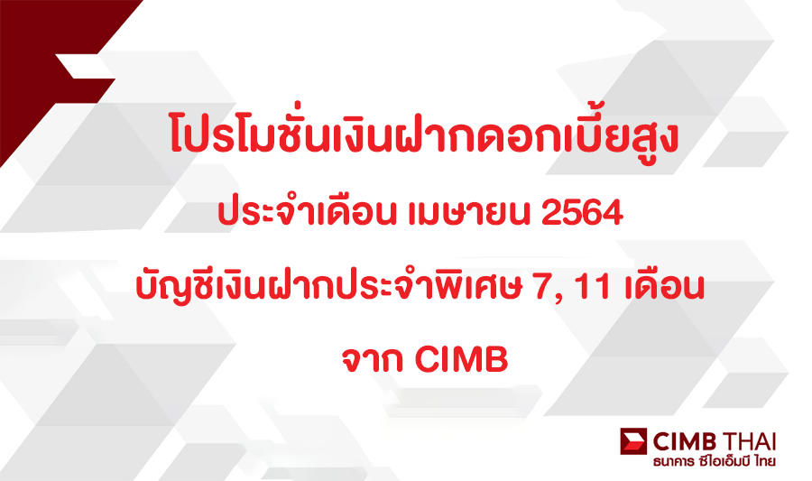โปรโมชั่นเงินฝากดอกเบี้ยสูงประจำเดือน เมษายน 2564 บัญชีเงินฝากประจำพิเศษ 7, 11 เดือน จาก CIMB