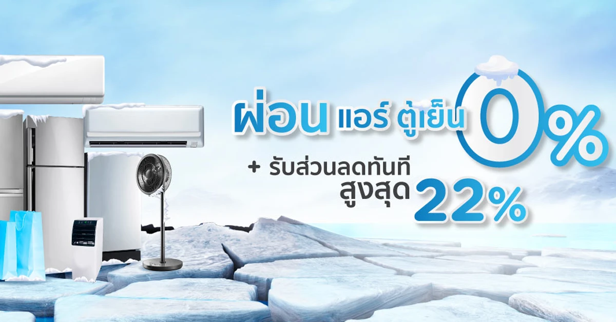 ผ่อนแอร์ ตู้เย็น 0% พร้อมรับส่วนลดทันที สูงสุด 22%