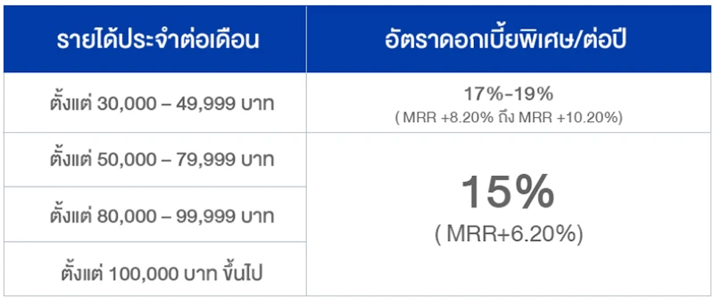 หมายเหตุ - อัตราดอกเบี้ยข้างต้นเป็นอัตราดอกเบี้ยอ้างอิงจากอัตราดอกเบี้ย MRR ตามประกาศ บมจ.ธนาคารไทยเครดิตเพื่อรายย่อยเท่ากับ 8.80% ต่อปี