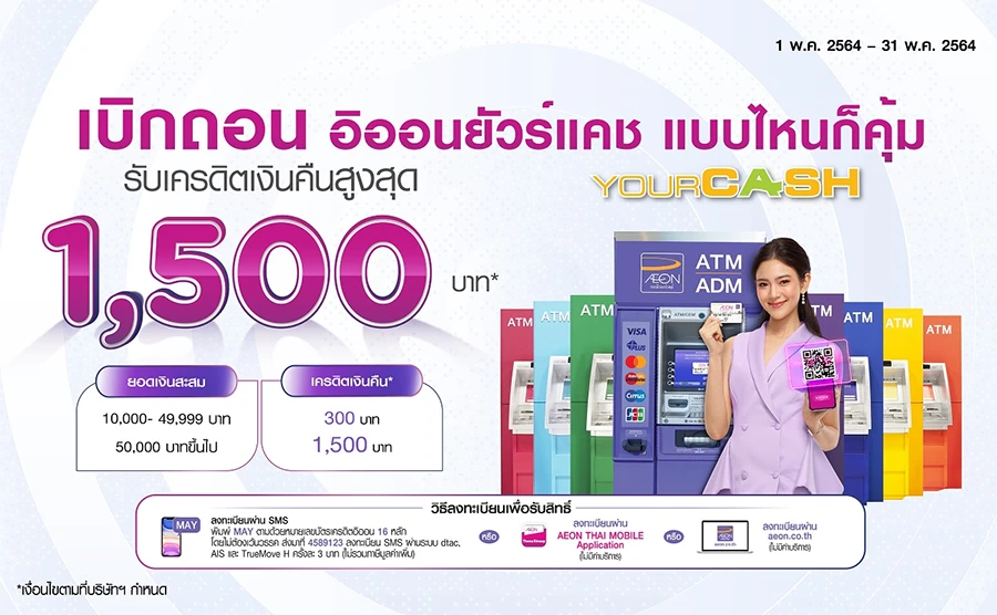 หมายเหตุ : วงเงินในการโอนวงเงินสินเชื่อยัวร์แคชและการเบิกถอนเงินสดเป็นไปตามวงเงินที่ได้รับอนุมัติจากบริษัทฯ ยอดที่ผู้ถือบัตรสามารถเบิกถอนเงินสดหรือโอนวงเงินได้ ขึ้นอยู่กับวงเงินคงเหลือในบัญชีและอาจมีการเปลี่ยนแปลงขึ้นอยู่กับประวัติการชำระเงิน) - บริษัทฯ สงวนสิทธิ์การเข้าร่วมรายการส่งเสริมการขาย เฉพาะผู้ถือบัตรที่ลงทะเบียนร่วมรายการส่งเสริมการขายทาง SMS ผ่าน เครือข่ายโทรศัพท์ DTAC, AIS และ TrueMove H เท่านั้น โดยพิมพ์ MAY ตามด้วยเลขที่บัตรสมาชิกฯ 16 หลัก ไม่ต้องเว้นวรรค ส่งมาที่ 4589123 และได้รับข้อความตอบรับจากระบบ (1 ครั้ง / บัตร / รายการส่งเสริมการขาย) ค่าบริการ 3 บาท/ครั้ง ไม่รวมภาษีมูลค่าเพิ่ม หรือ ลงทะเบียนผ่าน www.aeon.co.th หรือ AEON THAI MOBILE Application (ไม่เสียค่าบริการ) ภายในระยะเวลารายการส่งเสริมการขาย