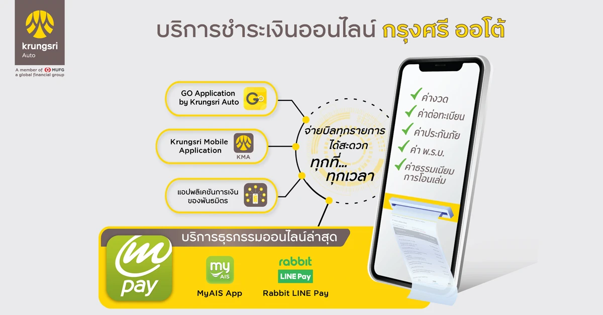 เพื่อยกระดับประสบการณ์ของลูกค้าให้ไร้รอยต่อยิ่งขึ้น ล่าสุด กรุงศรี ออโต้ ได้เปิดบริการผ่าน mPAY เพื่อนำเสนออีกทางเลือกในการชำระเงินแบบไร้การสัมผัส (Contactless Payment) ให้ลูกค้ากรุงศรี ออโต้ สามารถชำระบิลค่างวด ค่าต่อทะเบียน ค่าประกันภัย ค่าพ.ร.บ. และค่าธรรมเนียมการโอนเล่ม ฯลฯ ผ่านช่องทางการทำธุรกรรมบนโทรศัพท์มือถือของ mPAY ไม่ว่าจะเป็น MyAIS App และแพลตฟอร์ม Rabbit LINE Pay