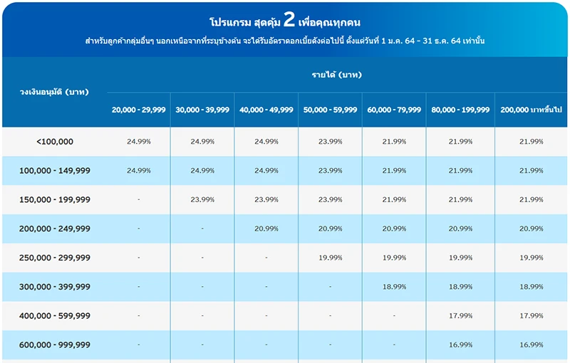 • บริษัทฯ ขอสงวนสิทธิ์ในการใช้หลักเกณฑ์และนโยบายภายในของบริษัทในการอนุมัติวงเงิน หรือปฏิเสธคำขอกู้ รวมถึงกำหนดอัตราดอกเบี้ยพิเศษซึ่งอาจแตกต่างจากตารางข้างต้น