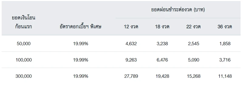 อัตราดอกเบี้ยฯ คำนวณแบบลดต้นลดดอก (Effective Rate) 19.99% ต่อปี หรือ เปรียบเทียบเป็นอัตราดอกเบี้ยฯ คงที่แบบประมาณการ (Flat Rate) 0.93% ต่อเดือน โปรดศึกษารายละเอียดและเงื่อนไขเพิ่มเติม