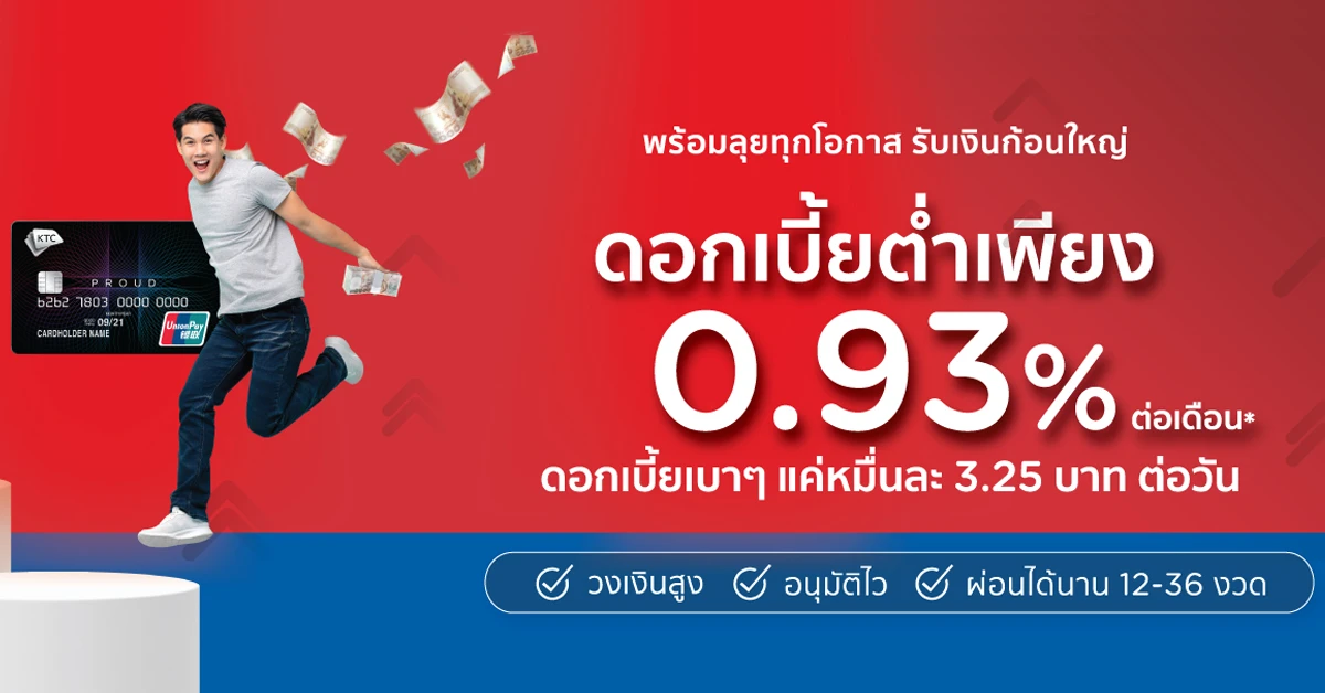 KTC PROUD สมัครวันนี้...รับเงินกู้ดอกเบี้ยต่ำ ดอกเบี้ยเบาสุดๆ เพียง 0.93% ต่อเดือน หรือ แค่หมื่นละ 3.25 บาทต่อวัน