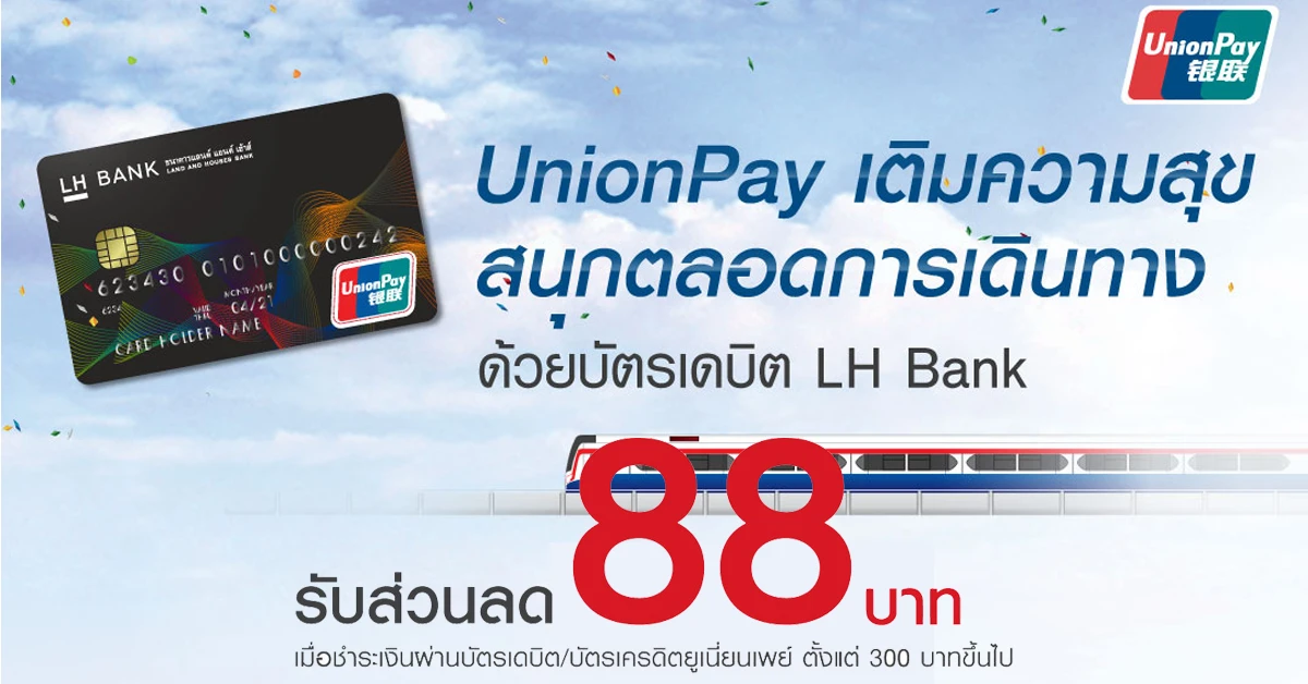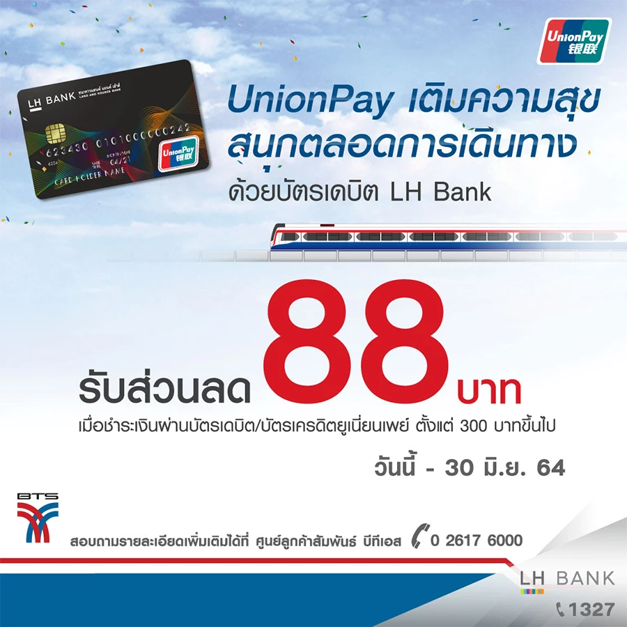 รับส่วนลด 88 บาท เมื่อซื้อบัตรโดยสารเติมเที่ยว หรือเติมเที่ยวและเติมเงิน ตั้งแต่ 300 บาทขึ้นไป ด้วยบัตรเดบิต LH Bank
