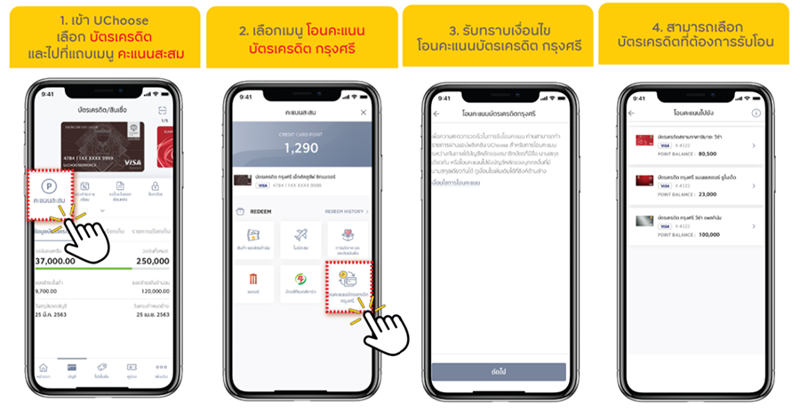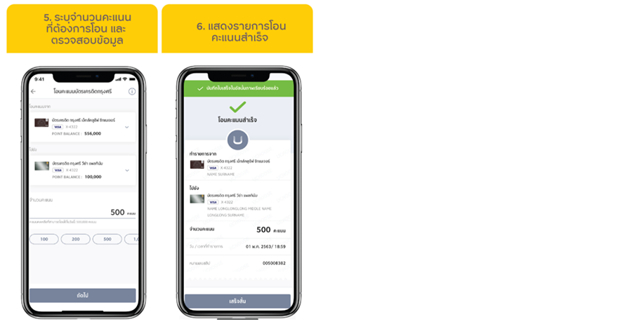 - กรณีสมาชิกบัตรแลกคะแนนเป็นเงินบริจาค คะแนนสะสมจะถูกตัดออกจากบัญชีบัตรเครดิตของผู้ถือบัตรตามจำนวนคะแนนที่ทำการแลก และไม่สามารถยกเลิกได้ทุกกรณี