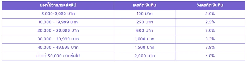 - บริษัทฯ จะเครดิตเงินคืนเข้าบัญชีบัตรหลักภายใน 90 วัน นับแต่วันสิ้นสุดระยะเวลารายการส่งเสริมการขาย ในกรณีที่ยังไม่ได้รับเครดิตเงินคืน หรือเครดิตเงินคืนไม่ถูกต้อง โปรดแจ้งให้บริษัทฯ ทราบภายใน 30 วัน นับแต่พ้นระยะเวลาดังกล่าว