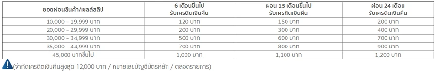 - ยอดเครดิตเงินคืนจะคำนวณยอดแบ่งจ่ายตั้งแต่ 10,000 บาทขึ้นไป / เซลล์สลิป และผ่อนชำระนาน 6 เดือนขึ้นไป