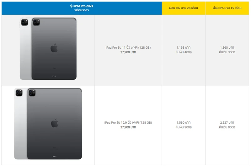 iPad Pro 2021 รุ่นที่ร่วมรายการผ่อน 0% สูงสุด 24 เดือน (ตารางราคาผ่อน 0%)