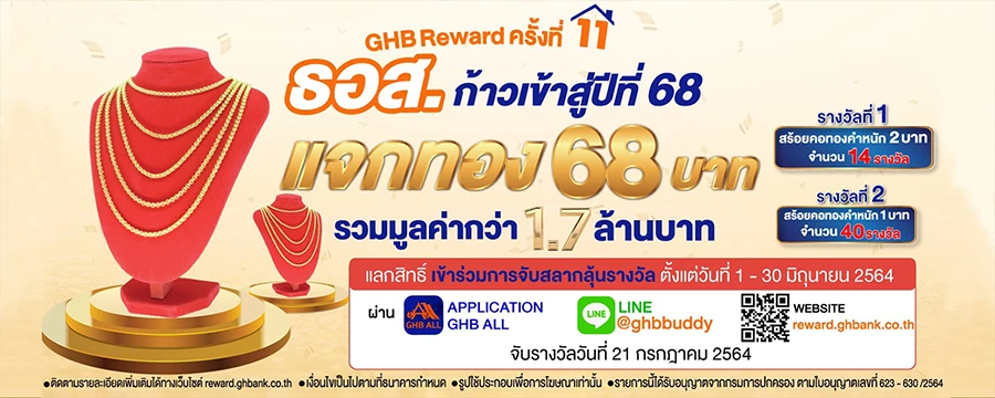 GHB Reward ครั้งที่ 11 ธอส. ก้าวเข้าสู่ปีที่ 68 แจกทอง 68 บาท แลกสิทธิ์ได้ตั้งแต่วันที่ 1 - 30 มิ.ย. 64