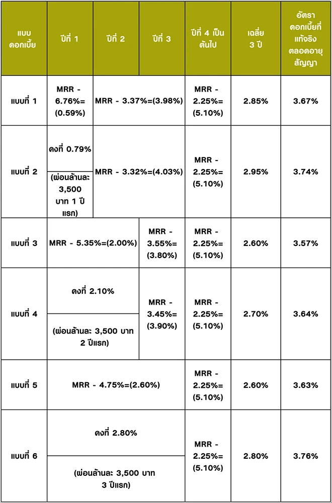 - อัตราดอกเบี้ยที่แท้จริงข้างต้นเป็นเพียงตัวอย่างอัตราดอกเบี้ยสำหรับสินเชื่อที่อยู่อาศัยวงเงิน 3 ล้านบาท อายุสัญญา 10 ปี MRR = 7.350% (ณ วันที่ 1 เม.ย. 64) ที่คำนวณตามเงื่อนไขที่ใช้ในโฆษณาฉบับนี้เท่านั้น ซึ่งอาจมีความแตกต่างตามเงื่อนไขการกู้ยืมของลูกค้าแต่ละราย